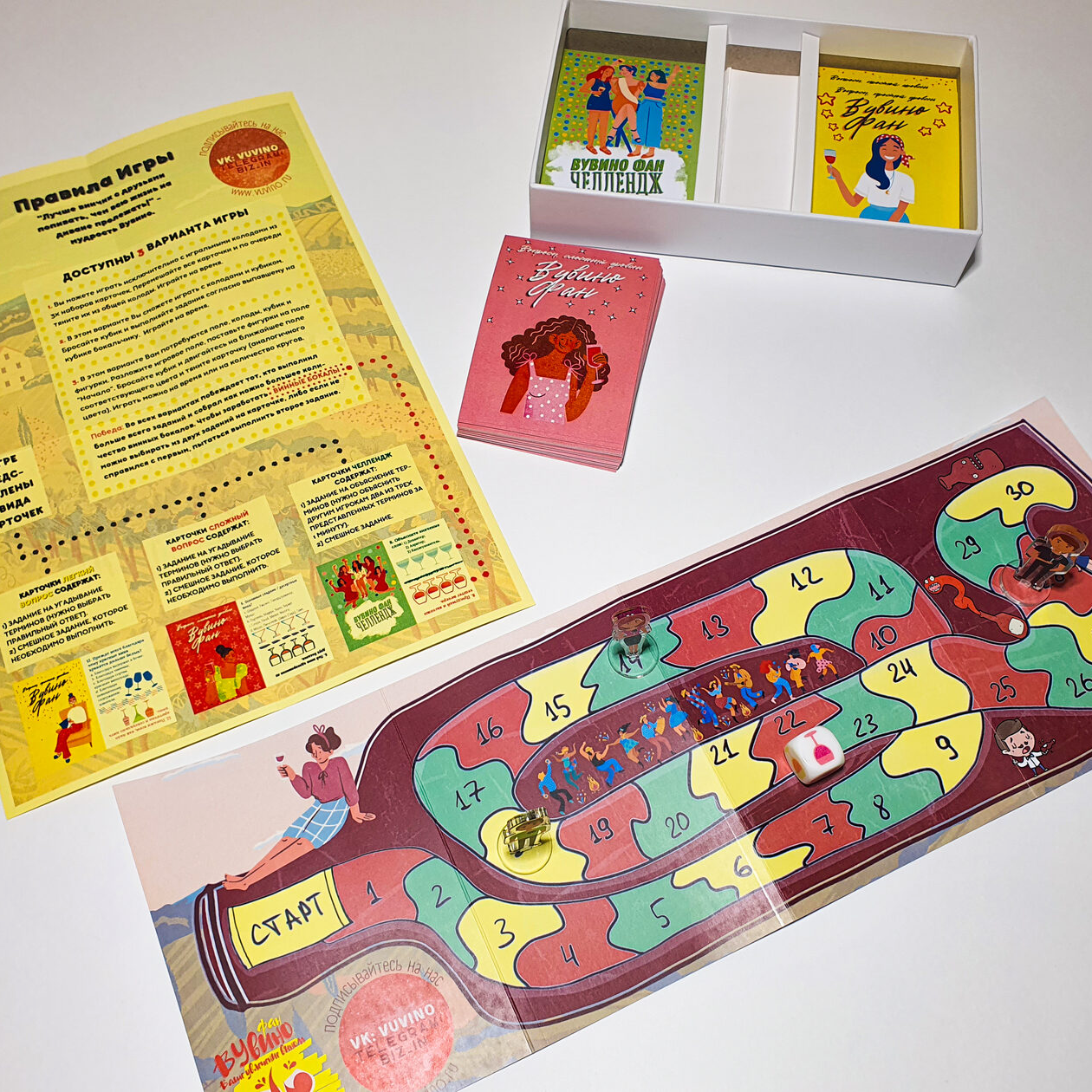 Розовое поле Попадая на данное поле Игрок вытягивает соответственно бледно-розовую карточку, в которой содержится сложный вопрос на винную тему и фановое винное задание. Игрок должен дать либо правильный ответ на винный вопрос, либо выполнить фановое задание, за что заработать бокальчики с вином.